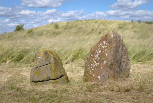 Before these relics were registered as ancient monuments, one of the stones in this stone-ship from 900 ac was damaged in an attempt to break it up and use it for a practical purpose. /